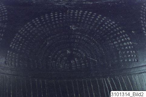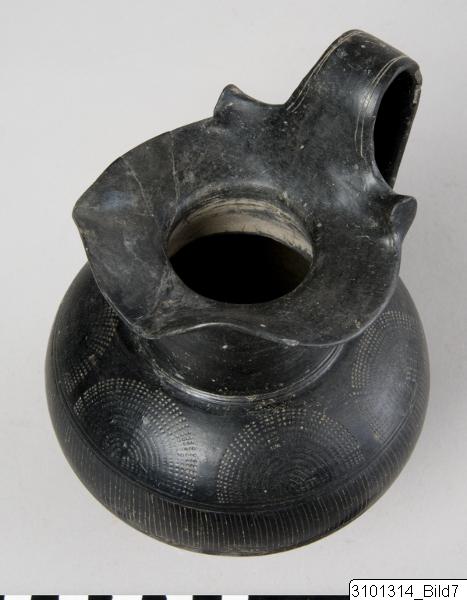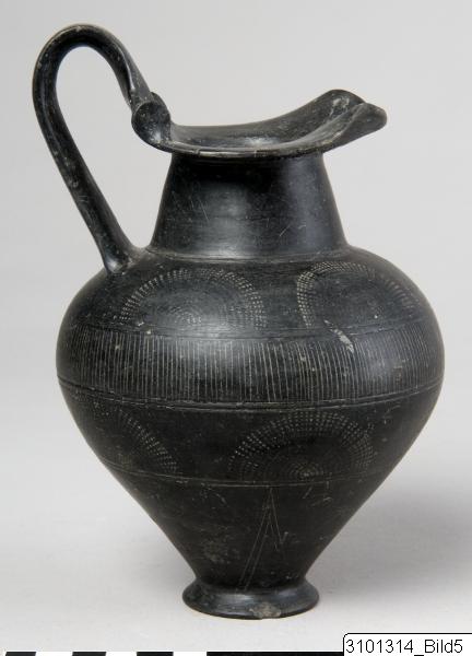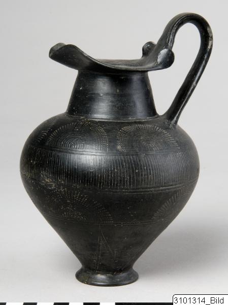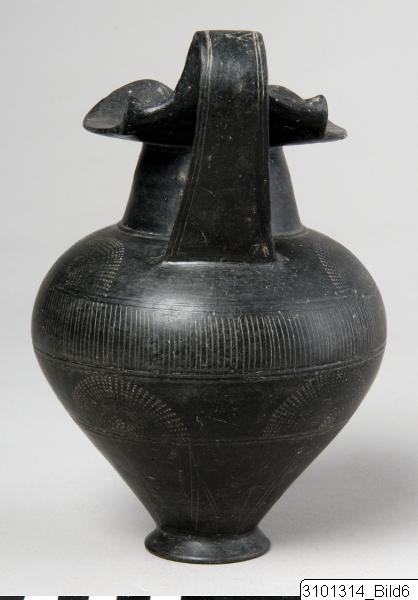 • Wide, trefoil mouth; flaring neck; piriform body with bulging shoulder; raised, vertical band handle from rim to shoulder; rolettes at upper handle attachment; small, flaring base. Grey to black fabric with fair sheen. Body separated into four zones by incised, double encircling lines; five open fans in handle zone; in the middle a zone of dense, vertical lines; below another row of open fans; elo... Visa hela