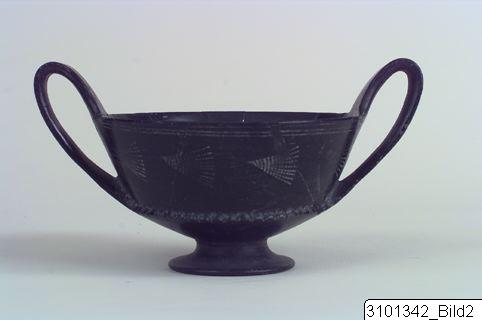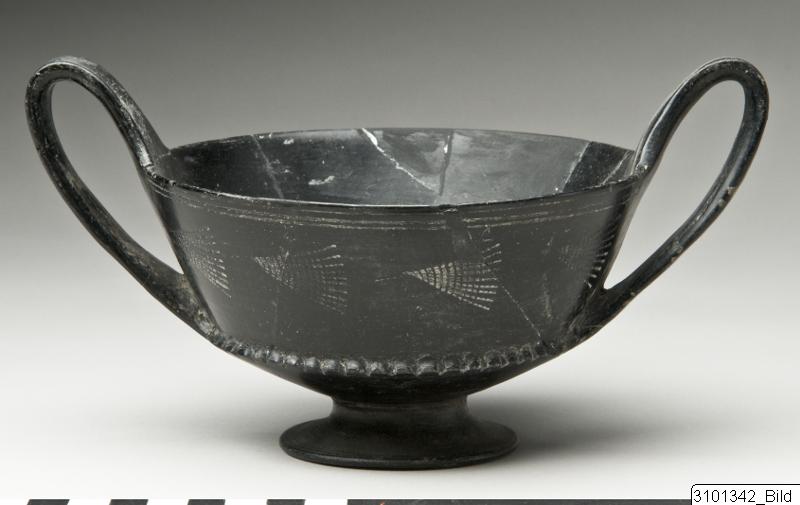 • Straight lip; low, conical bowl; raised, vertical band handles from rim to carination; low, flaring base. Black fabric with high sheen. Two horizontal lines on rim; horizontal, half-open fans on lip; large notches on carination.