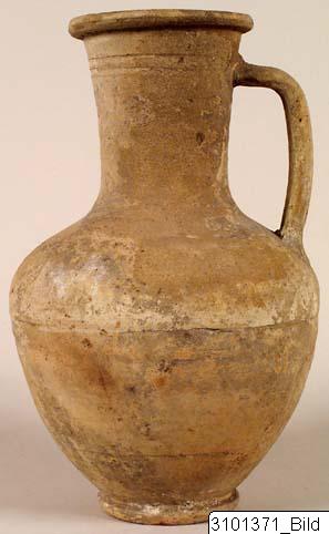 Everted rim with groove on top; long neck with two horizontal groovesjust below rim; slightly piriform body; handle ribbed on ext.; bevelled ringbase; yellowish brown clay; white coating all over the body and on inside of rim, but miscoloured on parts of neck and upper body.