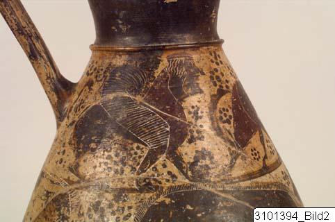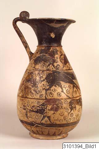 Round mouth with everted rim; concave neck with a ring at its base; ovoid body; ribbed band handle; rotelles on rim, on either side of the handle; bevelled ring base; buff clay, lustrous surface; decoration: the rim, neck and handle is painted brown on the exterior as well as the interiorthe decoration is divided into three friezes depicting animals painted in dark brown and maroon on a light yellowish-brown ground; the frieze below the neck depicts a sfinx turning right, a grazing deer and a roaring lion turning left; the second frieze depicts two wild boar turning right and a lion turning left, a fourth animal (a bird, prob. a swan) is barely visible next to the lion; the third frieze depicts a lion and a grazing deer turning right, a panther turning left and a wild boar turning right; in-between the animals are brown dot-rosettes; on each the rotelle is a similar rosette, but in white paint; the figures in the third frieze stand on a broad brown band below; brown rays shoot up from the base to that same broad band.