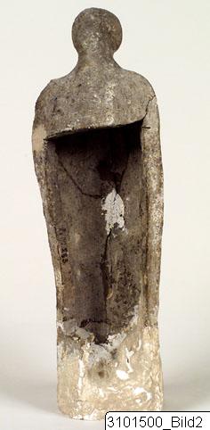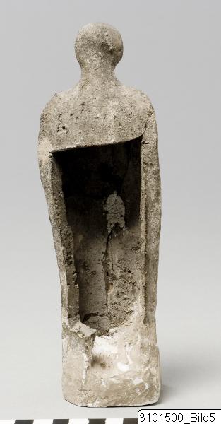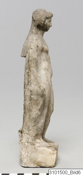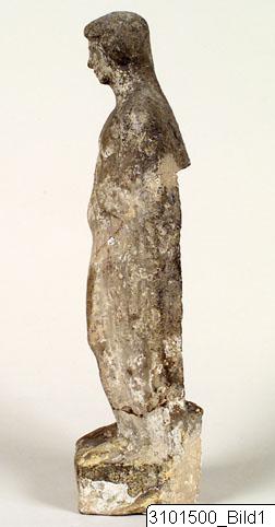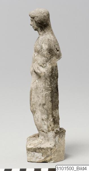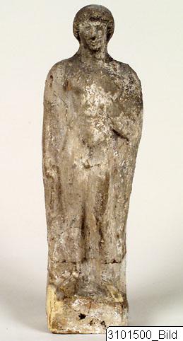 Youth standing on high base; stiff pose with weight on his right leg; dressed in a symmetrical cloak covering his back and shoulders, otherwise naked; he holds a cockerel in the crook of his left arm and his right arm hangs at the side; back not modelled; large rectangular vent in back (10.4 x 5.0). Grey clay with traces of glossy white slip all over the front and red paint on the cloak at his left side.