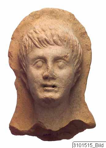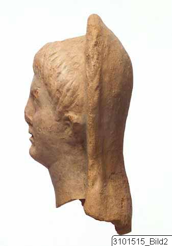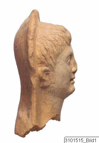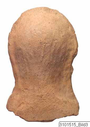 Moulded male head; oval face; straight hair, combed downwards, indicated by striations; almond shaped eyes; the back part is smoothed and taller than the front, forming a ridge at junction between front and back. Light red clay; reddish yellow slip.