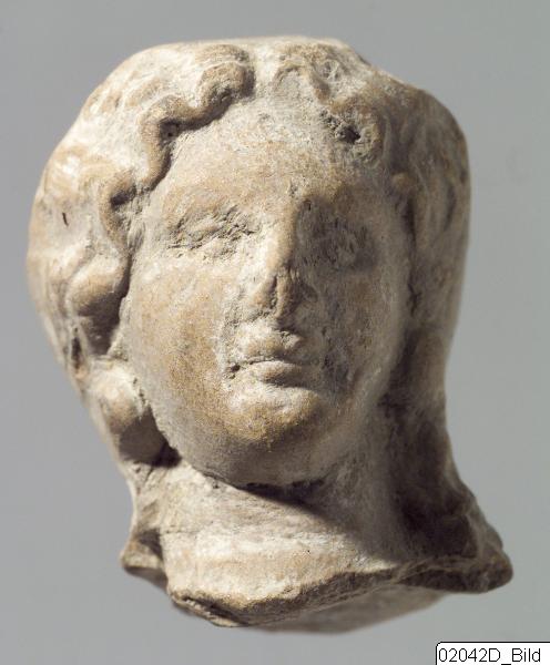 Mould-made head of female figure tited slightly to the right (figure´s left). Solid. Oval face with high forehead. Hair, parted in the middle, treated in separate, wavy strands on each side of the face, drawn back and tied at the nape of the neck. Fine, pale reddish-brown fabric with fine mica. White slip.