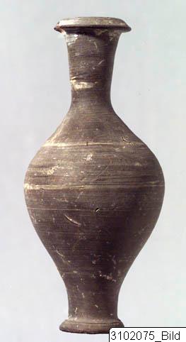 Fusiform unguentarium. Bulbous, piriform body. Short, hollowed stem. Flat base. Tall, narrow neck, slightly flaring. Broad, sloping lip. Narrow, painted bands on upper body and neck. Fine, dark grey fabric. Diluted white, and reddish-brown paint.