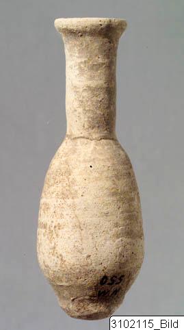 An unguentarium (pl. unguentaria) is a small container, typically made of clay or glass, for oil and perfumes. They are mostly associated with Hellenistic and Roman contexts, especially as grave goods. The so-called fusiform shape (from the Latin fusus, meaning “spindle”) is characteristic of Hellenistic unguentaria and is thought to have developed functionally from the lekythos. On the other hand, the so-called piriform shape (from the Latin pirus, meaning “pear”) is characteristic of the Roman era, especially the early Principate.