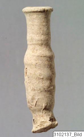 An unguentarium (pl. unguentaria) is a small container, typically made of clay or glass, for oil and perfumes. They are mostly associated with Hellenistic and Roman contexts, especially as grave goods. The so-called fusiform shape (from the Latin fusus, meaning “spindle”) is characteristic of Hellenistic unguentaria and is thought to have developed functionally from the lekythos. On the other hand, the so-called piriform shape (from the Latin pirus, meaning “pear”) is characteristic of the Roman era, especially the early Principate.