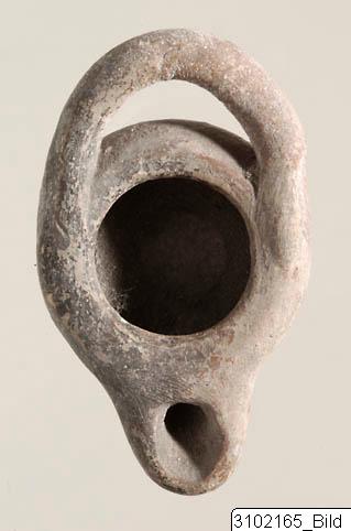 Wheel-made lamp. Shallow body with incurved walls. Fairly long, slightly tapering nozzle with rounded tip. Rounded handle, set at a slight angle to the horizontal. Flat base with rough surface. Fine, pale brown fabric with sparse, very fine mica. Dull, red glaze, fired black in places.
