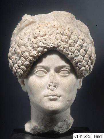 Female portrait head with very small part of right shoulder preserved. Full, oval face with high forehead. Almond-shaped eyes with upper and lower eyelids indicated. Thin brow. Small mouth with rather full lips and slightly drooping corners. Front hair, delimited by a stephane, is arranged in a high, wide coiffure of seven horizontal, neat rows of small, tight curls with (except for top row) small drilling- holes in the centre. Additional drill-holes between locks. Behind the diadem the hair is arranged in many thin fish-bone plaits laid backwards and twisted together in a knot, hollowed in the middle. On each side of neck are two hanging locks. White, crystalline (probably Italic) marble.
