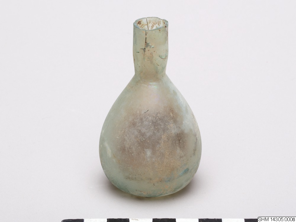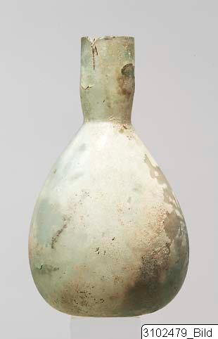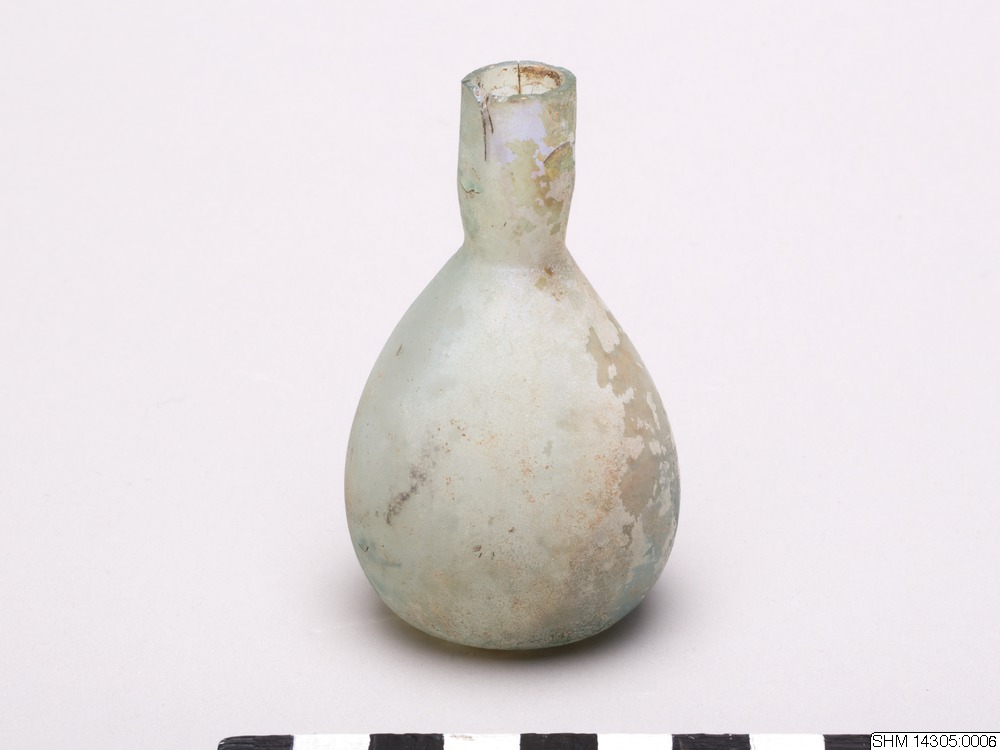 An unguentarium (pl. unguentaria) is a small container, typically made of clay or glass, for oil and perfumes. They are mostly associated with Hellenistic and Roman contexts, especially as grave goods. The so-called fusiform shape (from the Latin fusus, meaning “spindle”) is characteristic of Hellenistic unguentaria and is thought to have developed functionally from the lekythos. On the other hand, the so-called piriform shape (from the Latin pirus, meaning “pear”) is characteristic of the Roman era, especially the early Principate.