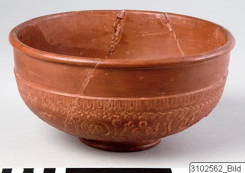 “Terra sigillata”, “Samian ware” or red-glossed pottery was manufactured in several parts of the Roman Empire. This type of pottery is rather standardized due to the fact that it was manufactured massively in workshops with the use of moulds. The principal workshops were in north Italy and Gaul. Regularly the wares bare stamps with the name of the potter. According to its characteristics the bowl may belong to a central Gaulish workshop.