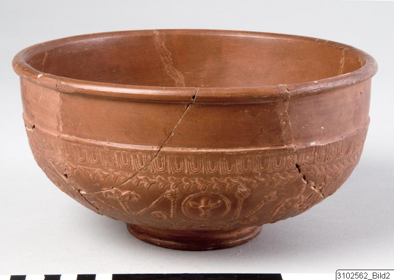 Terra sigillata/Samian ware, form Dr 37, deep hemispherical bowl with a beaded rim and a heavy foot-ring. High, vertical rim, set off from mould made body by a deep groove. Relief ornament: on upper part refined ovolo band, below encircling wreath in relief made up of pairs of plain leaves set end to end, rest decorated with elaborated figurative and floral relief motifs and medallions.