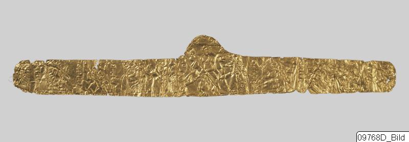 The diadem consists of a thin band of sheet gold, slighly tapering towards the rounded ends and with a rounded peak in the centre.The end on the right is pierced with two holes for attachment; on the end on the left, there is a loop consisting of gold wire with spirl ends, fastened at the back of the sheet through the two holes. The decoration is embossed on the gold foil, probably by hammering th...