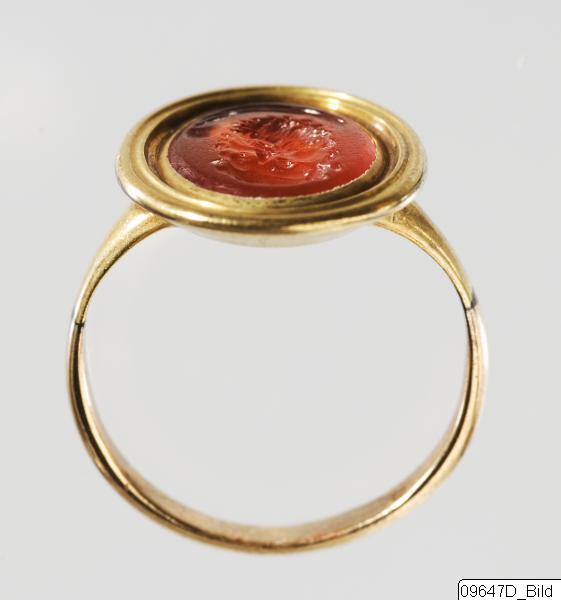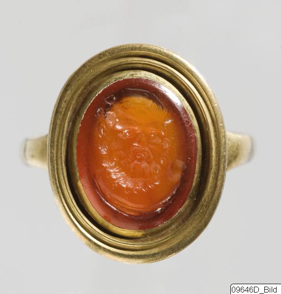 Oval ring with a reddish-brown cornelian in a modern gold setting. The stone is convex and is engraved as an intaglio of the head of a man in front view. The setting and the ring itself is gold. The design is modern (probably from the 17th or 18th century AD.). There are no inscriptions on either the stone or the ring. The engraving shows a bald man with a full, curly beard and bushy, drooping moustache. The hair appears full, but not too long, and is stylistically combed and curled over the forehead. A mantle is shown draped around his neck. It has been suggested that the engravning portrays Socrates.