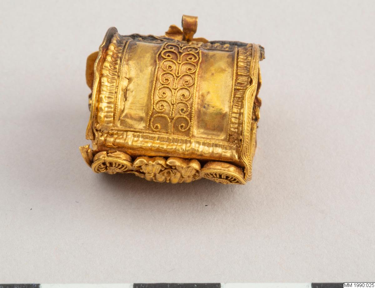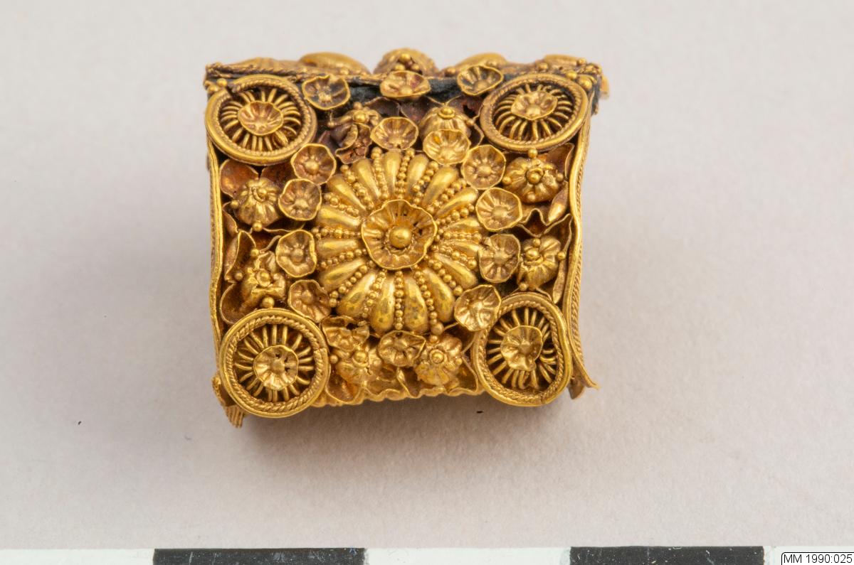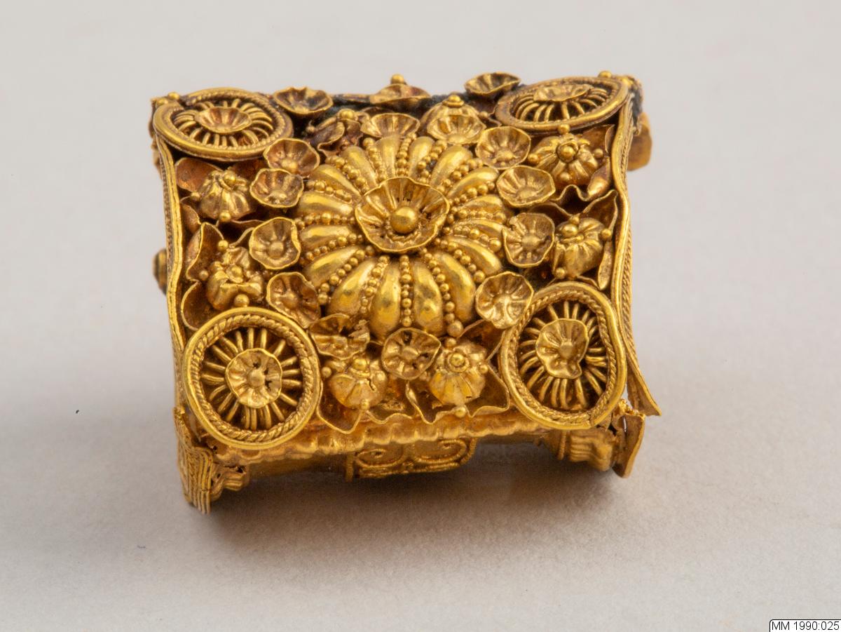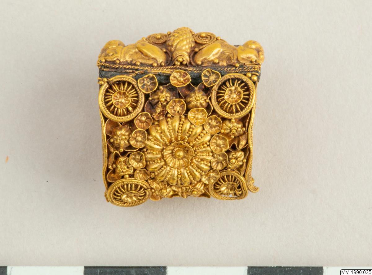 Ear-ring in shape of a cylindrical gold strip, of the ”a baule”-type. The front panel of the cylinder is decorated with a central many-petalled rosette of gold foil and granulation, eight four-petal flowers, fifteen small flower-cups, and four corner rosettes, each consistning of a similar flower-cup surrounded by radiating plain wires and a circle of one plain end one rope wire. The ends of the cylinder are open. The suspending wire, hinged and fastened between small tubes on the upper edge of the cylinder, is masked by a piece of stamped gold sheet representing an erect pinecone between two winged sphinxes, couched in opposite directions, with tails of strip-twisted wire, each coiled into a spiral punctuated by a globule. Other globules are placed along the base of the stamped pattern and at the centre of the four-petal flowers and the central rosette. The back panel is framed by a stamped tongue pattern and has along the middle of a row of stylized lily-cup spirals of beaded wire, between two borders of similar wire.