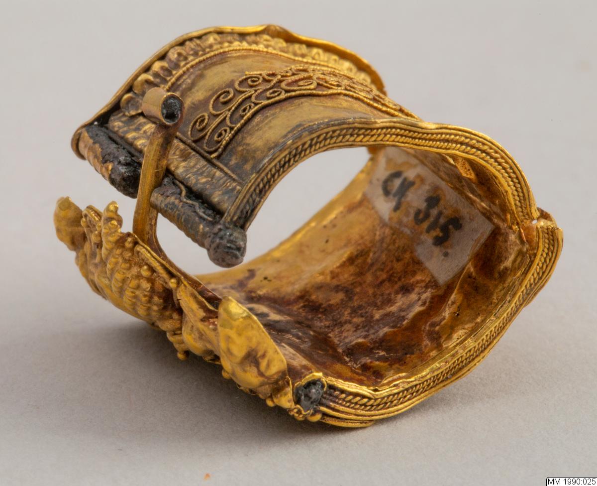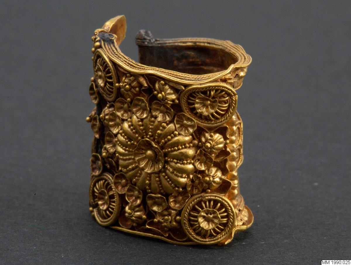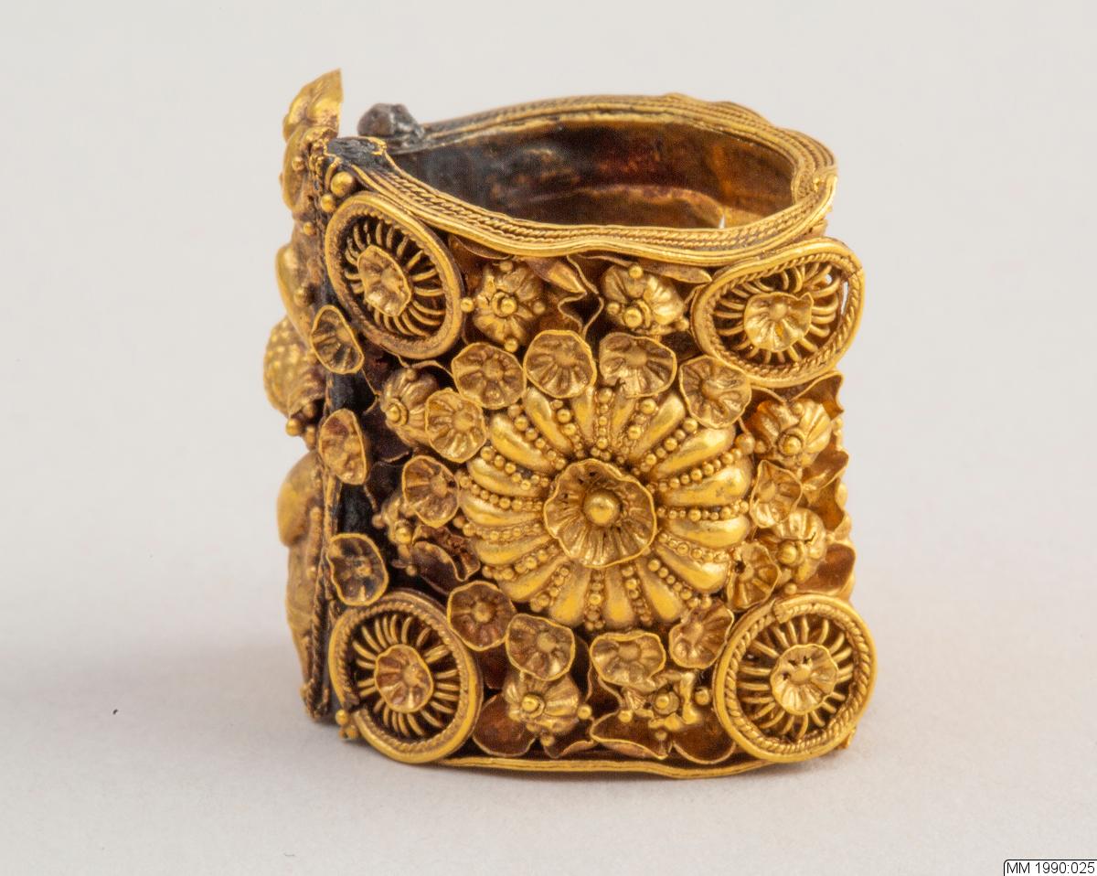 Ear-ring in shape of a cylindrical gold strip, of the ”a baule”-type. The front panel of the cylinder is decorated with a central many-petalled rosette of gold foil and granulation, eight four-petal flowers, fifteen small flower-cups, and four corner rosettes, each consistning of a similar flower-cup surrounded by radiating plain wires and a circle of one plain end one rope wire. The ends of the cylinder are open. The suspending wire, hinged and fastened between small tubes on the upper edge of the cylinder, is masked by a piece of stamped gold sheet representing an erect pinecone between two winged sphinxes, couched in opposite directions, with tails of strip-twisted wire, each coiled into a spiral punctuated by a globule. Other globules are placed along the base of the stamped pattern and at the centre of the four-petal flowers and the central rosette. The back panel is framed by a stamped tongue pattern and has along the middle of a row of stylized lily-cup spirals of beaded wire, between two borders of similar wire.