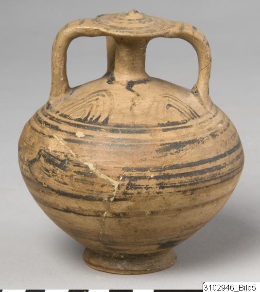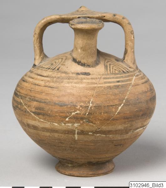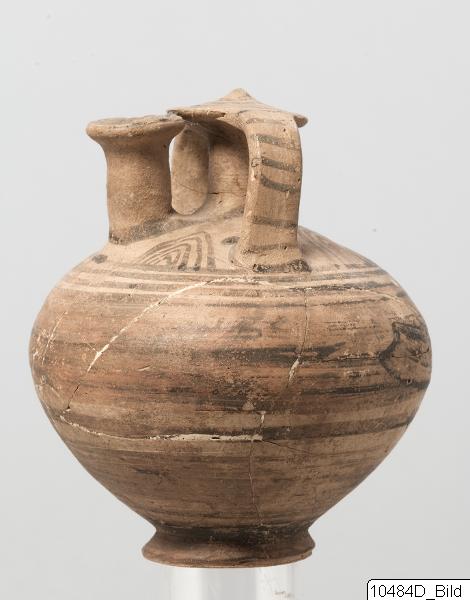 Roughly globular shape, pointed below and flattened above shoulder. Ring foot. The top of false neck is a large disc with slightly raised centre. Yellow clay with brownish varnish. Within the handle-ring are four lattice triangles. Body is decorated with encircling bands. A loop connects the bases of the false neck and spout. On top of the false neck is a spiral coil, the handles have vertical lin...