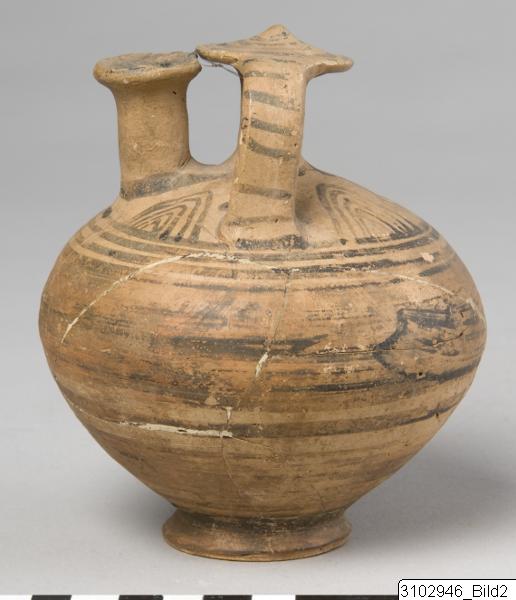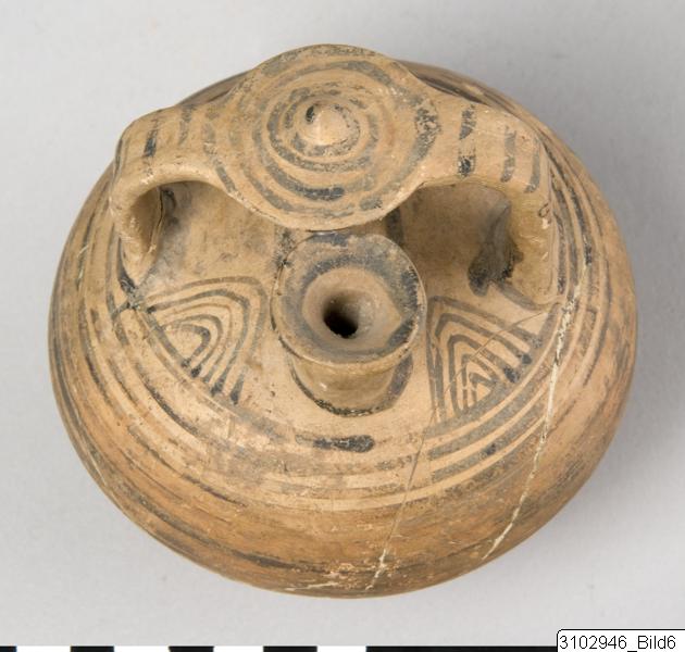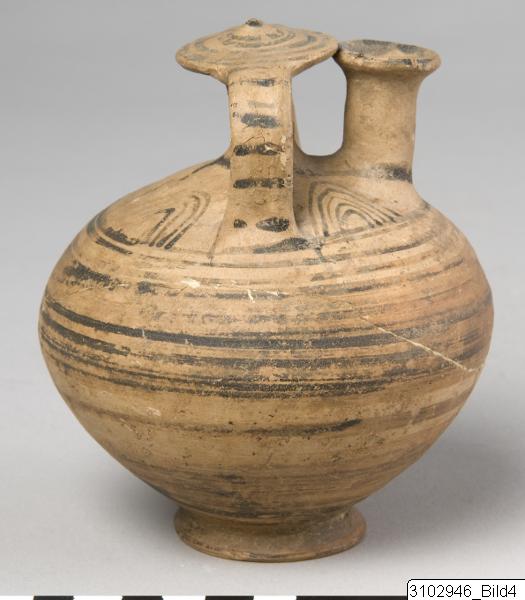Roughly globular shape, pointed below and flattened above shoulder. Ring foot. The top of false neck is a large disc with slightly raised centre. Yellow clay with brownish varnish. Within the handle-ring are four lattice triangles. Body is decorated with encircling bands. A loop connects the bases of the false neck and spout. On top of the false neck is a spiral coil, the handles have vertical lines.