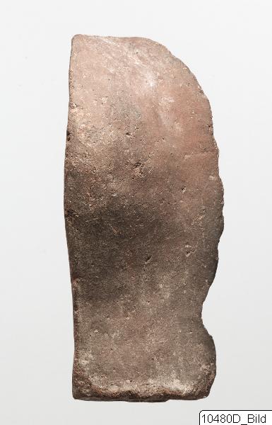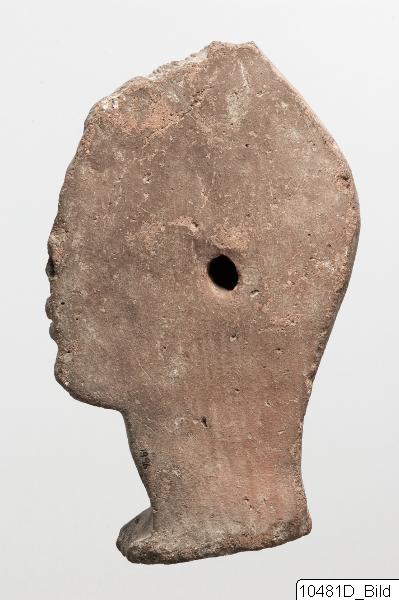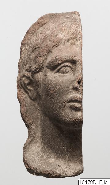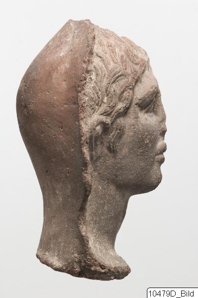 Profiled right side of a male head. Oval face. Almond-shaped eyes, wide opened. Accentuated lips. Wavy hair, combed downwards, with a curl in front of the ear. Back part of head unworked, with a ridge at the junction between back and front. The back side is unworked. Reddish clay, dark slip.