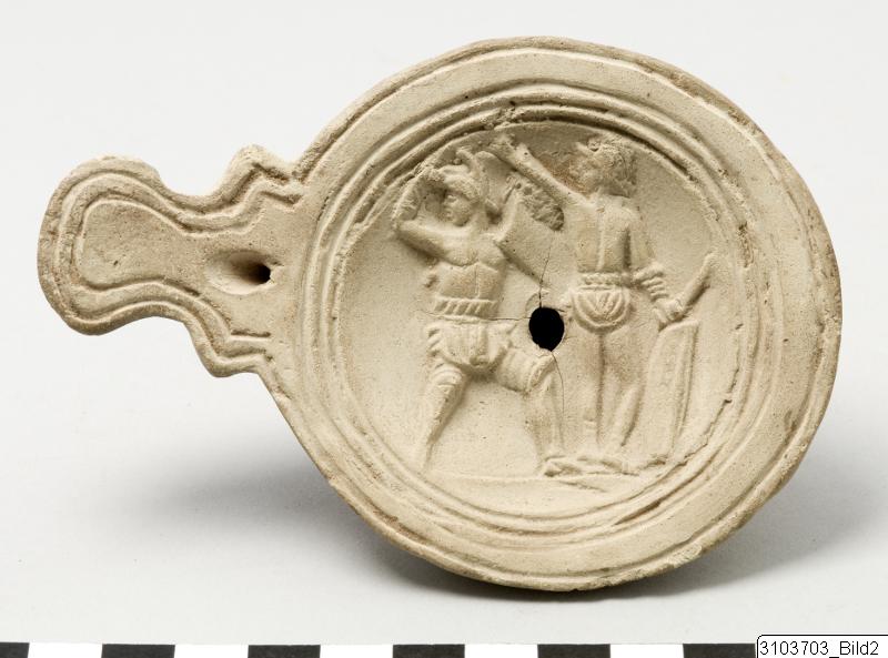 • Two gladiators in relief on discus. Buff clay.