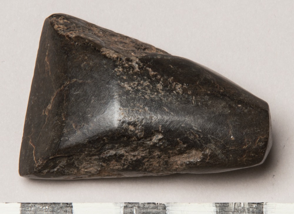 Smoothly polished axe. Straight cutting edge and narrow, sharp top. Black-brown stone.