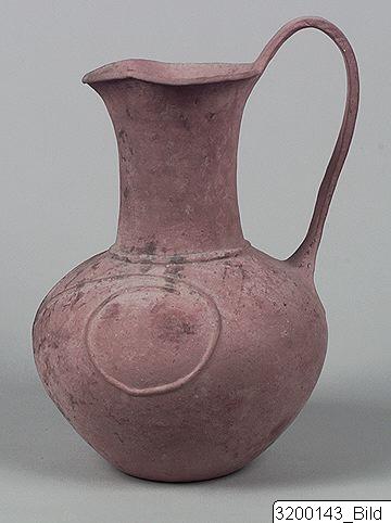 Flat base; squat body; two antithetic curved relief lines as front ornament; ridge encircling base of neck, tall, concave neck; pinched mouth; flat, arched handle from rim to shoulder. Hard pinkish clay; red lustrous to greyish black slip.