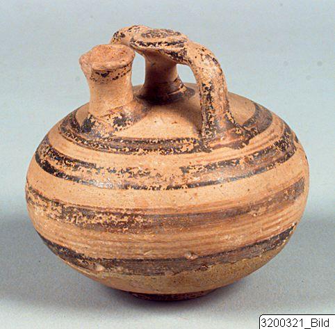Small base-ring; depressed globular body; concave neck; flat top-disc; round handles; concave spout; flaring rim. Hard, light brown clay; semi-lustrous, buff slip; lustrous, dark paint. Lines and bands encircling base, lower-, mid- and upper body. Band encircling base of spout and rim; band encircling base of neck. Handle painted.