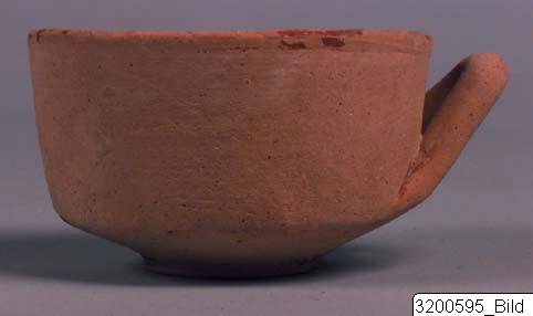• Raised flat base; conical lower body; convex mid- and upper body; round rim; horizontal, round, raised handle on mid-body. Hard, pinkish buff clay; matt, light buff slip; lustrous, red to brownish black paint. The only visible decoration is encircling band on base, lower body, rim and inside upper body; concentric circles on inside bottom.