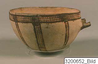 Deep milk-bowl; round base; hemispherical body; sharp rim; horizontal, triangular wish-bone handle below rim, major part missing. Hard, grey clay; matt, light slip. Matt, brown paint. Vertical rows of ladder pattern on body from base to rim; horizontal band with ladder pattern just below rim; vertical strokes on handle.