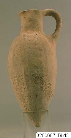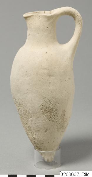 Pointed base; spindle-shaped body; concave neck; pinched mouth; flat, raised handle from rim to shoulder. Soft, buff clay; matt, buff, shaved slip.