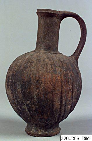 • Torus base; ribbed, ovoid body; ridge encircling neck-base; narrow, tall neck; indented rim; flat handle from rim to shoulder. Hard, brick clay; matt, dark grey slip.