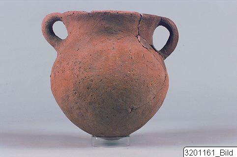 Round base; globular body; short, wide, concave neck; round rim; round handles from rim to shoulder. Hard, brick clay; matt, brick slip.