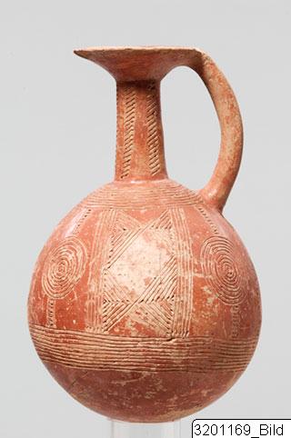 Round base; ovoid body; high, narrow neck tapering upwards; wide, funnel-shaped rim; round handle from rim to shoulder. Hard, buff clay; lustrous, orange red slip. Incised decoration consisting of encircling lines on lower body; concentric circles with framed horizontal strokes above and hatched triangles framed by panels on mid-body; encircling lines on shoulder; vertical rows of transverse strokes on neck.