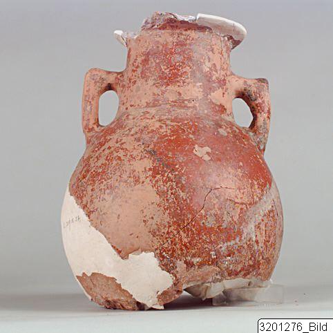 Round base; almost globular body; tall neck, tapering upwards; horizontal rim; plain, angular handles from mid-neck to shoulder. Hard, light brick clay; lustrous, red to brownish red slip.
