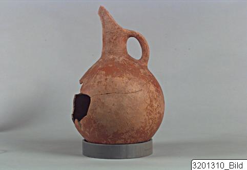 Round base; globular body; wide, slightly backwards curved neck; beaked mouth; oval handle from rim to shoulder. Hard, buff clay; matt, red to brownish red slip. Incised decoration consisting of vertical lines or zigzag lines from base to neck; lines encircling neck; horizontal lines on mouth; vertical zigzag lines on handle.