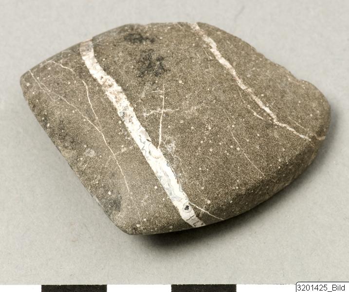• Convex, rather flat body; convex flat sides; straight cutting edge; polished. Amygdaloidal basalt.