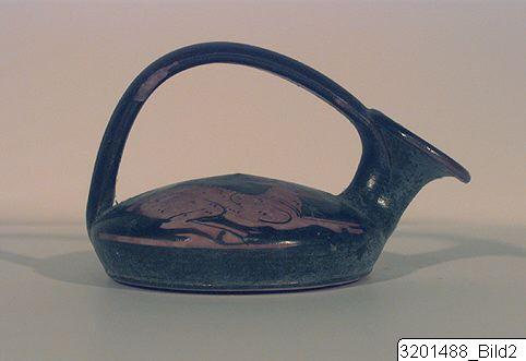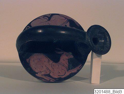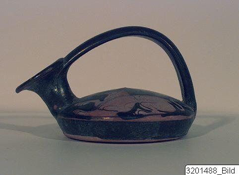 Slightly concave base; conical body; convex upper part; high, concave neck; wide, flaring rim; arched, flat handle from rim to shoulder, opposite spout. Hard, brick clay; lustrous, black slip. One lying dog with curled tail and one raised foreleg; on other side a galloping deer.