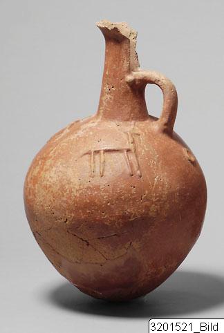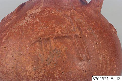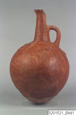 Round base; ovoid body; tall, cut-away neck tapering upwards; flaring rim; round handle from mid-neck to shoulder; three stags in relief on shoulder; one large, concave button ornament on shoulder below handle; two button projections on neck on either side of handle. Hard, brick clay; lustrous brownish red to reddish brown slip.