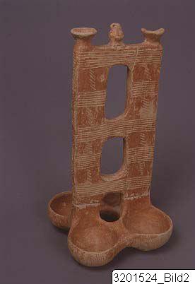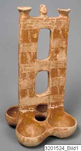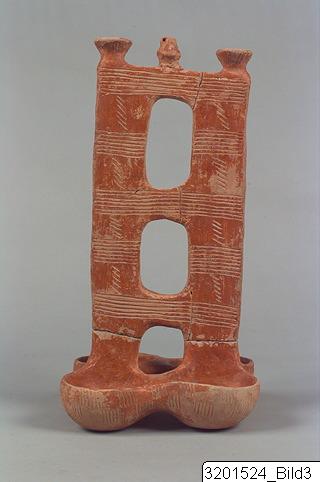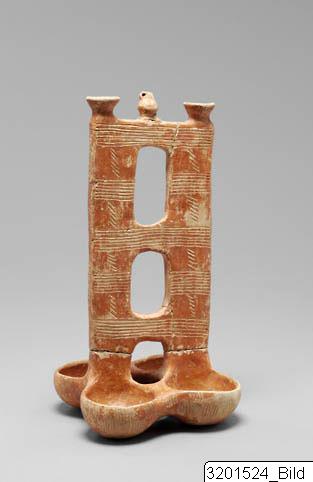 Four hemispherical bowls connected to a high, elaborate plankshaped handle rising from the junction of two pairs of bowls; handle pierced by three oval holes and surmounted by three miniature vases:two open bowls and one handled jug. Hard, buff clay; lustrous brownish red slip. Incised decoration consisting of sets of vertical lines arranged as a chequer-board pattern on bowls; bands of horizontal lines with groups of oblique strokes in the intersices on handle.