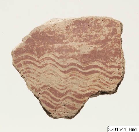 • Hand-made, slightly curved. Semi-soft grey clay; buff slip. Lustrous brownish red paint; preserved parallel wavy lines.