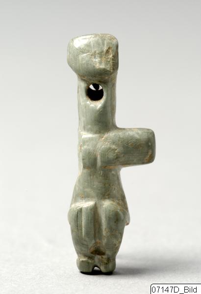 Stylized female idol in sitting position with bent legs; tall cruciform body; short outstreched arms; tall neck with drilled hole at centre; flat, rounded vertical head; flat back. Light green, polished picrolite.