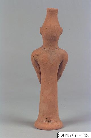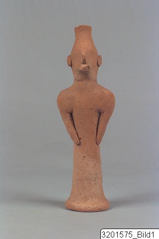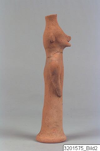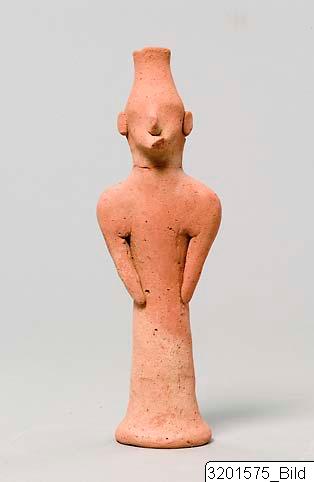 Splayed base; wheel-made, cylindrical body; sloping, wide shoulders; vertical arms without shaped hands; wide neck; trapezoid head; helmet and head in one and funnel-shaped; short beard; prominent nose; round, plastic ears. Hard, buff clay; matt, buff slip.