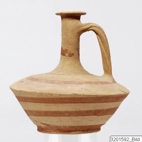 Ring-base; carinated body; long, narrow, concave neck; flaring mouth; rope-shaped, slightly raised handle from neck to shoulder. Buff clay; matt, buff slip; matt, red paint. Band encircling upper neck, just below rim; band encircling lower neck; band encircling shoulder; two bands encircling body; band encircling base; traces of paint on handle.