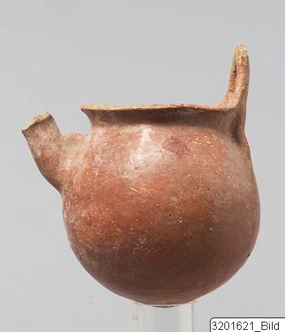 Slightly pointed base; deep, globular body; splaying rim; high, up-right wish-bone handle on rim; up-wards turned, tubular spout with small projection on shoulder opposite handle. Hard, buff clay; lustrous brownish red slip.