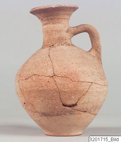 Ring-base; oval body with sligfhtly depressed shoulder; cylindrical neck with handle-ridge; out-turned rim; handle from neck to shoulder. Hard, light buff clay with black grits; matt light buff slip. Dark-grey to dark-red paint; band encirling lower body; red band bordered with black lines encircling mid-body; lattice-lozenge bordered with three parallel lines as front ornament on shoulder plus vertical lines, now almost entirely obliterated; band encircling neck base; three parallel lines encircling upper neck below rim; rim painted. Swasticas on shoulder and zigzag lines on handle now completely worn off.