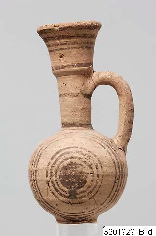 Ring-base; globular body; tall, narrow cylindrical neck with thick upper-part; wide funnel mouth; handle from mid-neck to shoulder. Hard, buff clay; matt, buff slip. Dark grey paint; vertical circles around painted centre on both sides of body; three crossed lines on front of body and below handle; line encircling neck-base; lines encircling mid- and upper neck; transverse strokes on handle.