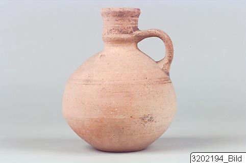 Flat base; almost globular body; short neck with mid-ridge; rounded rim; flat handle from mid-neck to shoulder. Hard, greyish buff clay with grits; matt buff slip. Traces of dark-red and grey paint. Lines encircling upper body, neck and rim; vertical zigzag band on handle.