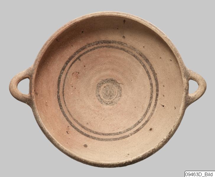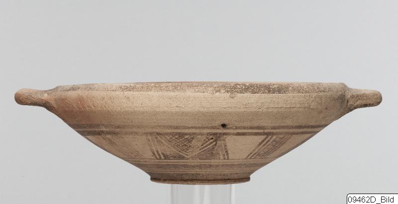 Ring-base; wide, conical body; inturned rim; round, horizontal handles just below rim. Hard, buff clay; matt, buff slip; matt, brown and dark grey paint. Exterior: brown and grey, concentric circles on bottom; grey, transverse strokes on base; four grey, framed, zigzag lines, four red, M-ornaments and grey latticed triangles,framed by grey lines on lower body; grey bands encircling mid-body; grey band encircling rim; handles painted grey. Interior: grey bands encircling mid-body; grey, concentric circles on bottom.
