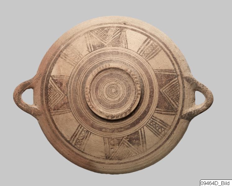 Ring-base; wide, conical body; inturned rim; round, horizontal handles just below rim. Hard, buff clay; matt, buff slip; matt, brown and dark grey paint. Exterior: brown and grey, concentric circles on bottom; grey, transverse strokes on base; four grey, framed, zigzag lines, four red, M-ornaments and grey latticed triangles,framed by grey lines on lower body; grey bands encircling mid-body; grey ...