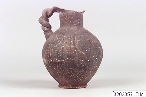 • Base-ring; oval body; vertical grooves on body; plain shoulder; slightly cylindrical neck; pinched rim; twisted handle from rim to shoulder. Hard, light buff clay; matt, dark grey slip.