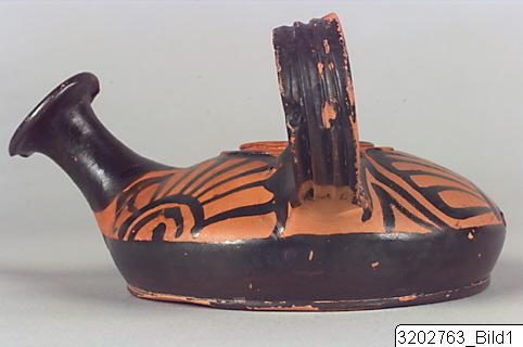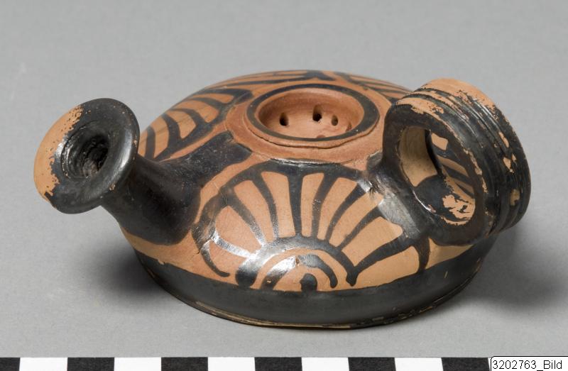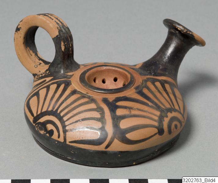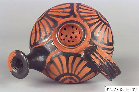 • Low, raised base; conical lower part; convex upper part; narrow, tall, concave spout; flaring rim; big, ridged handle from upper- to mid-part; deep strainer on top; ridge encircling strainer. Hard, brick clay; lustrous, black slip. Palmettes encircling body.